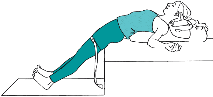 Сядьте на кровать, спиной к болстеру. Чтобы предотвратить дискомфорт или болезненные ощущения в области поясницы, заверните верхние части бедер внутрь и стяните их ремнем. Прогнитесь назад и лягте на болстер так, чтобы позвоночник проходил по его центру. Аккуратно опустите голову на сложенное одеяло и проверьте, чтобы лоб находился выше подбородка. Выпрямите ноги и поставьте пятки на пол. Соедините руки в замок и положите их на живот. Когда будете готовы, разведите руки в стороны и положите ладонями вверх. Чтобы выйти из асаны, подтяните к себе стопы, обопритесь руками на кровать и сядьте.