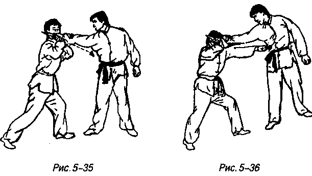 Корпус сразу же поворачивается вправо, одновременно обращенная центром вниз левая ладонь с концами пальцев в качестве точек приложения силы наносит резкий колющий удар в ребра или подмышечную впадину противника (рис. 5-36).