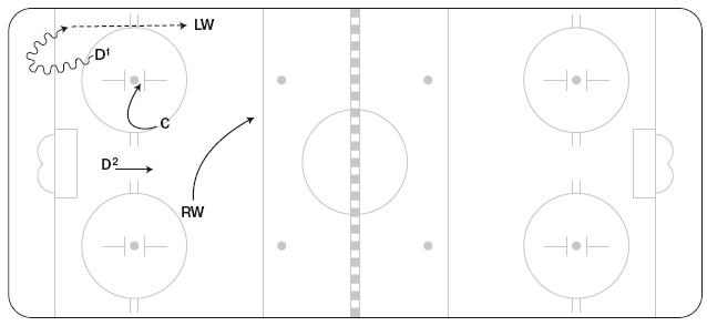 Когда D1 завладевает шайбой, D2 видит, что противники сгруппировались на площадке с одного фланга, поэтому он переходит в противоположный угол и выкриком предупреждает о «переходе» игры (рисунок 1.6). D1 выполняет прямой или с отскоком от борта пас по направлению к D2. D1 должен стремительно перемещать шайбу и не допустить ошибки, чтобы давление не перенеслось на D2 прежде, чем он выполнит передачу. Если же это случилось, форчекер может запросто пересечь площадку и добраться до D2, когда тот примет передачу. C осуществляет поддержку в глубине зоны, RW – с флангов, а LW перемещается по площадке, готовый прийти на помощь.