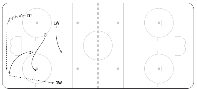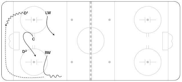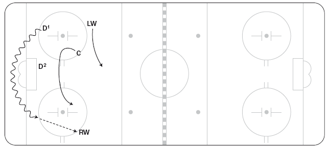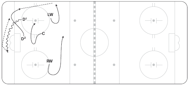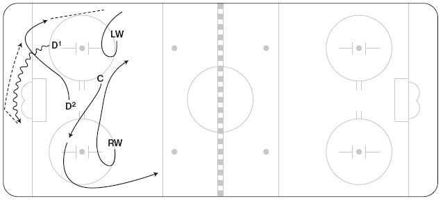 Иногда тренеры предпочитают, чтобы центральные и крайние нападающие переходили к игре по схеме «назад», что позволяет им сохранять скорость: команда должна убедиться, что обмен позициями совершается стремительно, и в случае перехвата шайбы риск оказывается сниженным за счет готовности команды к обороне. Как видно на рисунке 1.9, когда D1 разворачивается за воротами, C спешит ему на помощь. Если D1 возвращает шайбу назад, C может продолжить движение к борту, а RW может переместиться к центру площадки, чтобы поддержать направленную назад передачу D2.