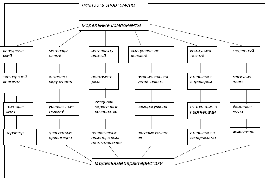 Модель личности спортсмена состоит из шести основных структурных компонентов, показывающих основные направления исследования личности спортсмена: поведенческий, мотивационный, интеллектуальный, эмоционально-волевой, коммуникативный, гендерный.