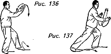 Движение 1 (продолжает рис. 135): Поднимите левую руку ладонью вперед перед грудью, чтобы она оказалась сверху над правым запястьем, образуя крестообразное пересечение. Затем разведите руки в стороны и очертите ими окружности, чтобы в результате ладони вновь оказались перед грудью перекрещенными, поверхностями внутрь, причем левая должна быть ближе к груди, чем правая. Одновременно с этим шагните левой ногой вперед и перенесите на нее центр тяжести своего тела, переходя на левый “шаг вдоль кромки радуги”, придвиньте правую ступню к левой, опираясь носком на землю. Взгляд должен быть направлен вправо (рис. 136, 137, 138).