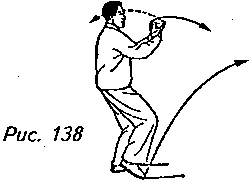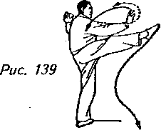 Движение 2: Разведите руки как можно дальше в стороны по горизонтали, сохраняя локти чуть согнутыми, а ладони вывернутыми от тела. Одновременно поднимите правую ногу и мягко вытяните ее параллельно правой руке, держите носок направленным вперед. Взгляд обращен на правую ладонь (рис. 139).