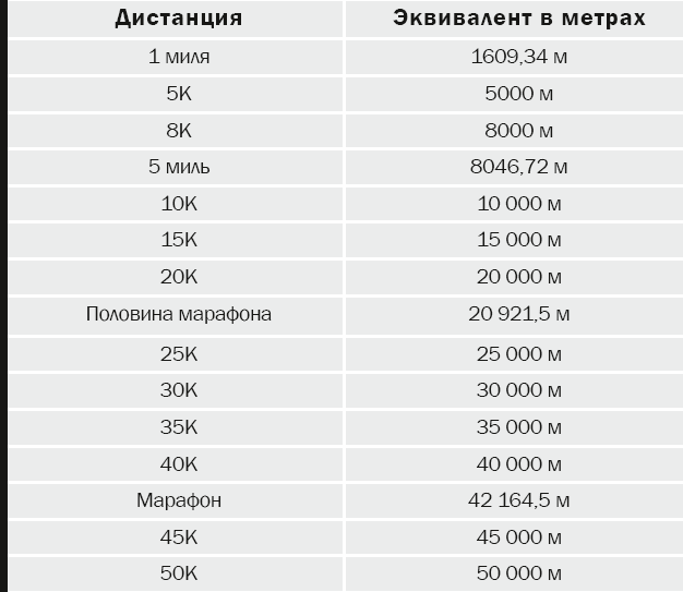 Как видите, существует много дистанций, которые преодолевают спортсмены, бегущие по шоссейным дорогам, грунтовым дорожкам, тротуарам и тропам во всем мире. Конечно, забег может проводиться на любую произвольную дистанцию. Можно получить много удовольствия, если договориться «просто бежать отсюда до того столба». Причина, по которой дистанции стандартизированы, а маршруты точно вымерены и даже сертифицированы, состоит в стремлении получить возможность для сравнения времени, за которое преодолевают дистанцию бегуны. Таким образом, региональные и даже мировые рекорды становятся достоверными и сравнимыми. Они позволяют сравнивать ваши показатели с показателями ваших друзей, а также отслеживать свой прогресс от забега к забегу.