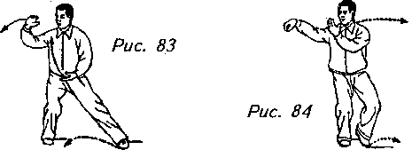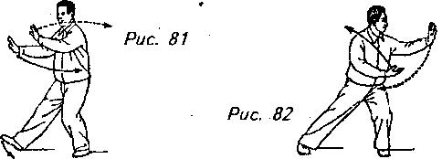 Движение 1 (продолжает рис. 80): Отклоните верхнюю часть корпуса назад, перенесите вес своего тела на левую ногу и поверните кончики ее пальцев направо внутрь. Сделав это, поверните верхнюю часть тела влево, проведите ладони (левая выше, чем правая) поперек груди влево до тех пор, пока левая рука не окажется на одном уровне по горизонтали с левым боком вашего тела, а правая рука (согнутая в локте) должна при этом оказаться прямо перед грудью. Взгляд теперь направлен на левую ладонь (рис. 81, 82).