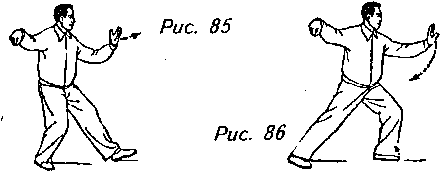 Движение 3: Немного поверните верхнюю часть корпуса влево, левой ногой сделайте шаг влево и перенесите на нее центр тяжести тела, переходя на левый “шаг вдоль кромки радуги”. Одновременно с этим поверните левую ладонь от себя и вытолкните ее влево, чтобы пальцы оказались на уровне глаз. Проследите за тем, чтобы руки были слегка согнуты, плечи опущены, а локти расслаблены. Взгляд по-прежнему направлен на левую руку (рис. 85, 86).