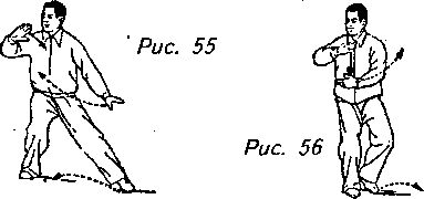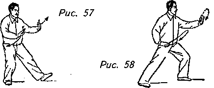 Движение 2: Сделайте левой ногой шаг вперед , и перенесите на нее вес своего тела, переходя на левый шаг вдоль кромки радуги”. По завершении этого действия передвиньте левую руку сначала вперед, потом ладонь переместите назад и влево на уровне плеча, при этом ладонь должна быть направлена к вашей груди, а локоть чуть согнутым, как если бы вы отражали внезапную атаку. Одновременно с этим опустите правую руку к правому бедру, удерживая ладонь направленной вниз. Взгляд нужно направить на левую руку, выдвинутую вперед. Это движение называется “отражение удара” (рис. 57, 58).