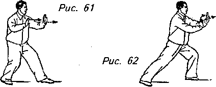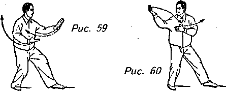 Движение 3: Выведите левую руку вперед с ладонью, направленной вниз, переместите правую руку по диагональной кривой над животом до запястья левой руки, повернув правую ладонь вверх; затем обе руки должны передвинуться по искривленной траектории назад, вниз и вверх, вправо до тех пор, пока правая рука не окажется на уровне плеч, ладонь направлена вверх; а левая рука должна находиться прямо перед грудью с ладонью, обращенной к телу. В этот момент медленно перенесите центр тяжести на правую ногу. Взгляд направлен в сторону правой руки. Это движение называется "откат назад” (рис. 59, 60).