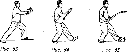 Упражнение “Ухватить Птицу за хвост слева” состоит из четырех основных движений. Они по традиции называются: "Пэнь”, что означает "отражение удара”, и это показано на рис. 57, 58; “Лю”, что значит “откат назад”, как показано на рис. 59, 60; “Цзи”, что означает “стискивание”, как показано на рис. 61, 62; и “Ань”, означающее “Толчок”, и это показано на рис. 66.