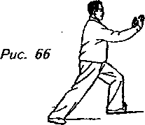 Указание: Когда вы будете выталкивать ладони вперед, верхняя часть вашего тела должна быть приподнята, а поясница и бедра расслаблены. Толкающее движение рук обязательно надо согласовывать с расслаблением поясницы и сгибанием ноги. Обе ладони должны двигаться по искривленной траектории, а руки — полусогнуты, образуя дуги.