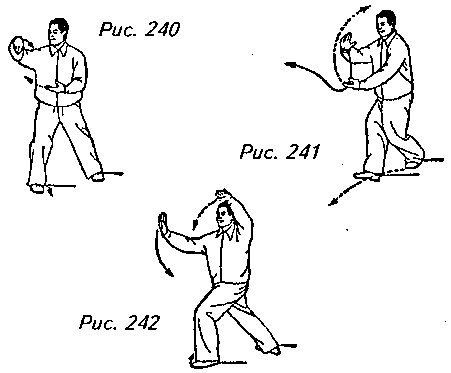 Движение 1 (продолжает рис. 239): Перенесите центр тяжести чуть назад на правую ногу и выверните левый носок вовнутрь (на 130°). Затем вновь возвратите центр тяжести на левую ногу, поверните правый носок наружу (приблизительно на 130°) и одновременно поверните корпус на 180° вправо. Распрямите сложенную в клювообразную форму правую кисть и верните ее к правой стороне груди с ладонью, направленной вниз; переведите левую руку вниз и поперек живота, чтобы с ладонью, направленной вверх, она оказалась под правой кистью, образуя с правой рукой положение “обхватывание мяча”. Затем шагните вперед и влево левой ногой, переходя на левый “шаг вдоль кромки радуги”. Одновременно с этим поднимите левую руку по кривой, чтобы она оказалась над головой с ладонью, направленной под углом вверх, и вытолкните правую руку вперед от середины груди по кривой, на уровне носа, ладонью наружу. Взгляд должен при этом быть направлен на правую ладонь (рис. 240, 241, 242).