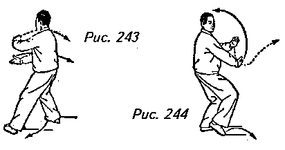корпус на 180° вправо, располагая правую ступню за левой и касаясь носком земли. Одновременно с этим перенесите обе руки к груди, образуя позицию “обхватывание мяча”, чтобы левая ладонь оказалась над правой. Затем поднимите правую ногу и шагните ею вправо, переходя на правый “шаг вдоль кромки радуги”. При этом поднимите правую руку по кривой перед лицом, чтобы она оказалась над головой с ладонью, направленной под углом вверх, и вытолкните левую руку вперед от середины груди по кривой, до уровня носа, ладонью наружу. Взгляд должен при этом быть направлен на левую ладонь (рис. 243, 244, 245).