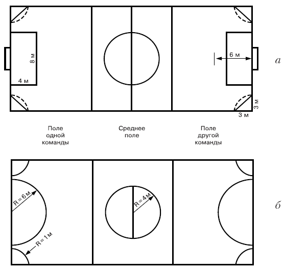 Рис. 3. Разметка площадки для игры в гандбол 7 ? 7 в разные периоды: а – по правилам 1923 г., б – по правилам 1948 г.
