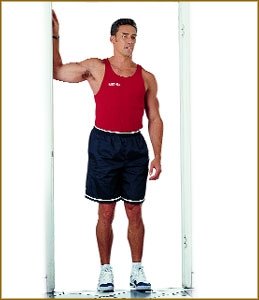Упражнение: встаньте в дверной проем и обоприте согнутую в локте руку на косяк. Выдохните и медленно разверните туловище вокруг вертикальной оси, подав «рабочее» плечо вперед. Проделайте то же самое с другой рукой.