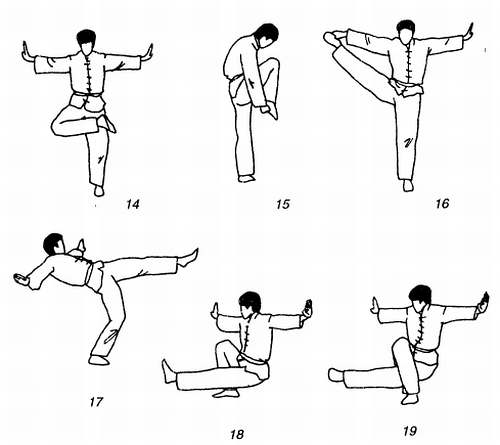 Особенности: опорная нога прямая, пальцы рук направлены вверх, голова поднята, внимание сосредоточено на дань-тянь. Пальцы опорной ноги «хватают землю».