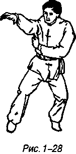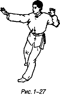 Из позиции для атаки швыряемой ладонью правая нога толкает землю, левая нога делает полшага вперед, вертикальное левое предплечье с локтевым краем в качестве точки приложения силы поворачивается вокруг своей оси внутрь блокируя влево, одновременно корпус поворачивается влево, правая ладонь с центром ладони и пальцами в качестве точки приложения силы наносит резкий раздавливающий удар вперед-вниз, следуя движению, правая нога подшагивает на полшага образуя левую гунгуйбу (рис. 1-27).