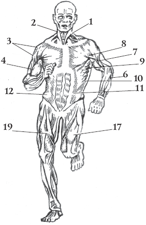 Мышцы представляют собой активную часть опорно-двигательного аппарата человека. Благдаря их сокращению человек способен выполнять различные движения и решать двигательные задачи. Мышцы человека составляют около 30-40% веса тела. В теле человека насчитывается около 600 отдельных мышц. Каждая отдельная мышца имеет свое название: по функции (сгибатели, разгибатели); по форме (камбаловидная, трапециевидная); по числу головок (двуглавая, трехглавая); по положению на теле (межреберные).