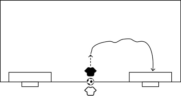 Схема 25.1. «Аварийный выход». Используйте участок поля шириной 11 метров и длиной 7–9. По краям поля на стартовой линии расположены ворота шириной 1,8 метра. Атакующий игрок начинает с линии, положение – ноги врозь, мяч между ног, защитник за спиной. Защитник выбивает мяч из-под ног нападающего, и игра начинается. Цель игрока атаки – первым добраться до мяча и завести мяч в одни из ворот. Защитник побеждает, если забирает мяч или выбивает его за пределы поля.