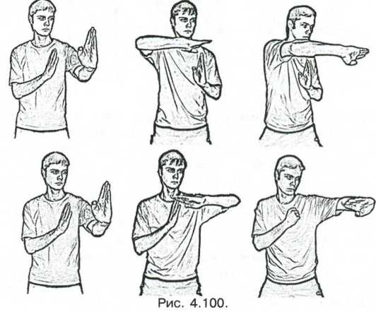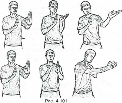 Базовая техника удара. Из исходного положения рук в базовой стойке локоть левой руки поднимается, вся рука занимает горизонтальное положение параллельно полу (рис. 4.100). Ладонь левой руки смотрит вниз. Далее за счет резкого выпрямления локтевого сустава наносится удар ребром ладони. Практически также осуществляется удар правой рукой. Основная цель удара - горло противника.