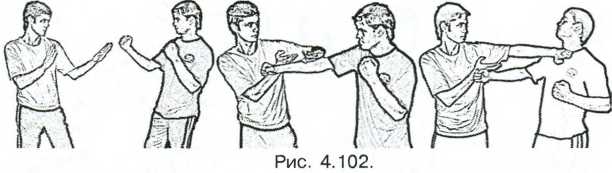 На рис. 4.102 противник наносит прямой удар правой рукой. Боец осуществляет двойной круговой блок с внешней стороны и накрывает двумя руками ударную руку противника. Одновременно боец группирует левую руку для прямого удара в горло ребром ладони. Правая рука осуществляет контроль ударной руки противника давлением вниз, а левая наносит удар в горло.