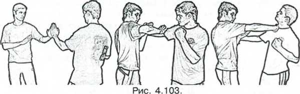 На рис. 4.103 противник наносит прямой удар правой рукой. Боец осуществляет двойной круговой блок с внутренней стороны и одновременно группирует правую руку для прямого удара в горло ребром ладони. Левая рука осуществляет контроль ударной руки противника давлением вниз, а правая наносит удар в горло.