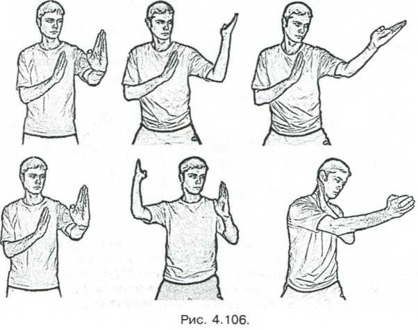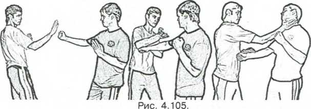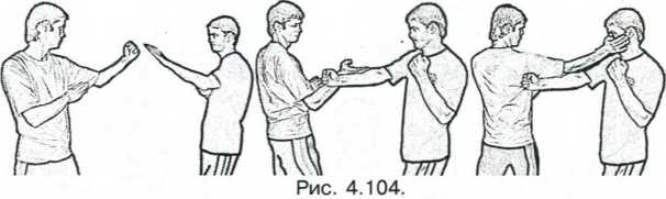На рис. 4.104 противник наносит прямой удар правой рукой. Боец осуществляет круговой блок правой рукой с внешней стороны и накрывает ударную руку противника. Ударная рука противника отводится немного вниз и резко наносится удар ребром ладони.