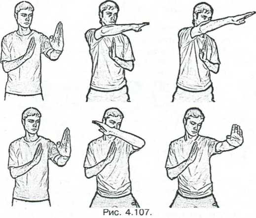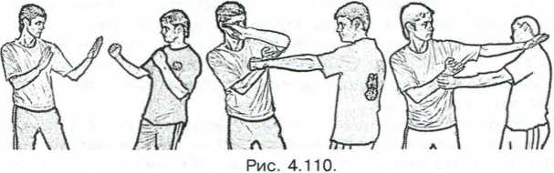 На рис. 4.110 противник наносит удар левой рукой. Боец совершает круговой блок правой рукой с внутренней стороны и накрывает ударную руку противника. Одновременно левая рука заносится на рубящий удар. Осуществляя контроль над ударной рукой противника, боец завершает комбинацию рубящим ударом ребром ладони.