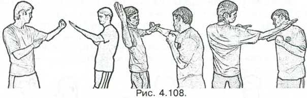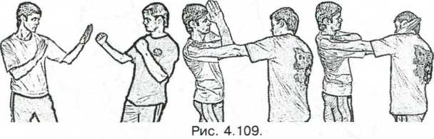 На рис. 4.108 противник наносит удар правой рукой. Боец совершает уводящий блок ладонью левой руки с внутренней стороны. Одновременно левая рука заносится на рубящий удар. Осуществляя контроль над ударной рукой противника (по возможности в виде захвата), боец завершает комбинацию рубящим ударом ребром ладони правой руки в шею противника.