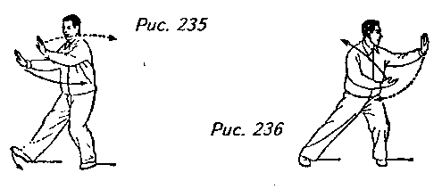 Движение 1 (продолжает рис. 234): Медленно отклоните верхнюю часть корпуса назад, перенесите вec своего тела на левую ногу и поверните кончики ее пальцев направо внутрь. Сделав это, поверните верхнюю часть тела влево, проведите ладони (левая выше, чем правая) поперек груди влево до тех пор, пока левая рука не окажется на одном уровне по горизонтали с левым боком вашего тела, а правая рука (согнутая в локте) должна при этом оказаться прямо перед грудью. Взгляд теперь направлен на левую ладонь (рис. 235, 236).