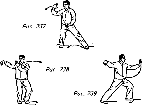 Движение 3: Немного поверните верхнюю часть корпуса влево, левой ногой сделайте шаг влево и перенесите на нее центр тяжести тела, переходя на левый “шаг вдоль кромки радуги”. Одновременно с этим поверните левую ладонь от себя и вытолкните ее влево, чтобы ее пальцы оказались на уровне глаз. Проследите за тем, чтобы руки были слегка согнуты, плечи опущены, а локти расслаблены. Взгляд по прежнему направлен на левую руку (рис. 239).