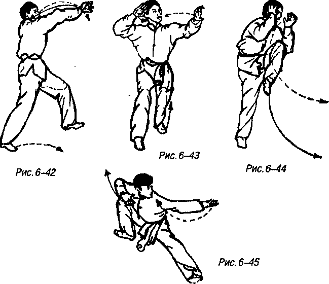 Продолжая предыдущее движение правая нога сгибаясь в колене приседает, левая нога опускается впереди и вытягивается вдоль земли, левый носок заворачивается внутрь образуя левую пубу, одновременно корпус поворачивается вправо, обращенная центром внутрь правая ладонь обхватывающим движением идет к правой стороне груди, левая ладонь поворачиваясь вокруг своей оси внутрь спереди идет влево-вверх резким вцепляющимся движением, рука на высоте плеча, центр ладони обращен влево-вверх, смотреть на левую ладонь (рис. 6-45).