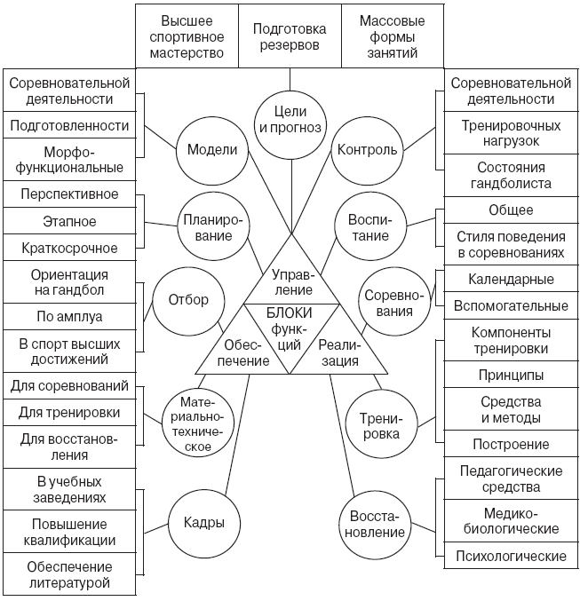 На основе общего представления о системе подготовки высококвалифицированных спортсменов на рис. 107 показана схема системы многолетней подготовки гандболистов высокой квалификации, которая содержит три крупных блока функций: управления, обеспечения и реализации. Каждая из подсистем включает в себя все блоки схемы подготовки гандболиста. Однако значимость и содержание их в каждой неоднозначны.