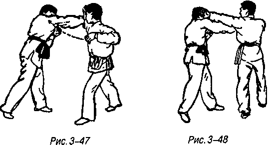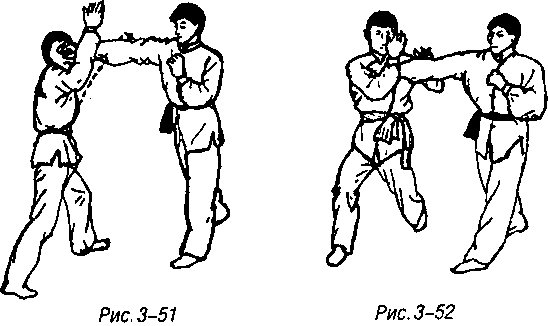 Из позиции для атаки швыряемой ладонью или позиции для разведки дороги рубящей ладонью, когда противник правым кулаком наносит прямой удар в лицо или грудь, я, левой ногой следуя движению, перешагиваю влево, уклоняясь от удара (рис. 3-49).