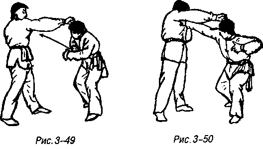 Следуя движению корпус поворачивается влево, правая рука, выпрямляясь резко наносит колющий удар концами пальцев в правую подмышечную впадину противника, центр ладони обращен вперед-вниз (рис. 3-50).