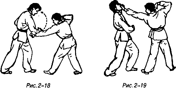 Когда противник блокирует рукой вниз, быстро вернуть левую руку, следуя движению сместить вес вправо, корпус повернуть вправо, левая рука, поворачиваясь вокруг своей оси наружу, идет верх и с тыльной стороной ладони в качестве точки приложения силы сверху вперед-вниз запрокинутой ладонью наносит швыряемый удар в лицо противника, корпус чуть подается влево (рис. 2-19).