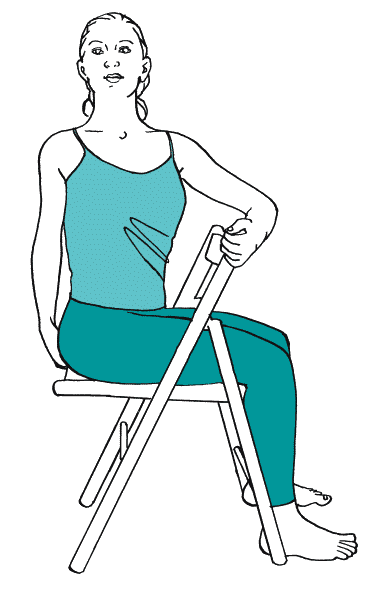 Для более сильного скручивания позвоночника упритесь тазовыми костями в сиденье стула и, удерживая бедра параллельно друг другу, обхватите левым предплечьем спинку стула, чтобы создать усилие рычага. Одновременно переместите правую руку как можно дальше назад и еще больше разверните корпус и раскройте грудную клетку. Продолжайте вытягивать позвоночник и удлинять боковые поверхности корпуса. Не напрягайте живот и не прогибайтесь в пояснице. Вернитесь в исходное положение и выполните асану в другую сторону.