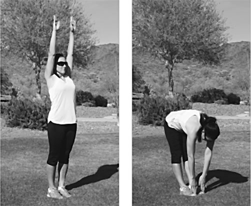 1. Станьте прямо, ноги примерно на ширине плеч, спина прямая. Поднимите руки прямо над головой, ладони обращены вперед. Потянитесь насколько возможно вверх.