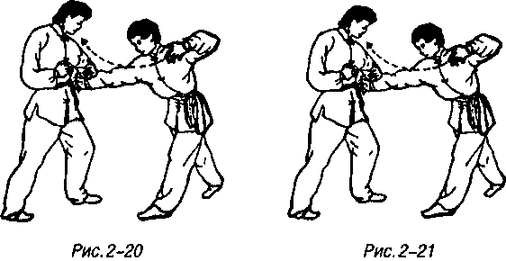 Из позиции для атаки швыряемой ладонью правая нога толкает землю, левая нога продвигается вперед, одновременно обращенная центром вниз левая ладонь с кончиками пальцев в качестве точки приложения силы наносит колющий удар в горло, корпус подается вперед, ноги распрямляются, правая нога касается земли передней частью подошвы (рис. 2-22).