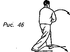 Движение 1 (продолжает рис. 45): Поверните корпус налево, а левый носок от себя. Выполнив это, отведите в сторону правую руку ладонью вниз и, сжав ладонь в кулак, опустите ее вниз и влево по закругленной траектории, чтобы тыльная сторона кулака оказалась обращенной вверх. Одновременно с этим переместите свой центр тяжести на левую ногу и, согнув немного правую ногу, приподнимите ее пятку и выверните наружу. Взгляд должен быть обращен на левую ладонь (рис.46)