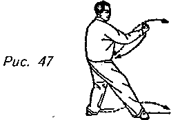 Движение 2: Поверните корпус тела вправо, проведите перед грудью правый кулак, направленный тыльной стороной вниз, а левую ладонь опустите вдоль левого бедра. Одновременно с этим правой ногой сделайте шаг вперед, держа носок вытянутым наружу. Взгляд обращен на правый кулак (рис. 47).