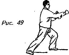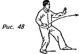 Движение 3: Перенесите центр тяжести своего тела вперед на правую ногу и шагните вперед левой ногой. Одновременно с этим переместите левую ладонь немного влево, затем вверх и вперед по закругленной траектории, поза должна соответствовать вашему желанию перехватить удар противника, ладонь направлена под углом вниз. Отведите правый кулак назад к правой стороне поясницы, держа его тыльной стороной вниз. Взгляд обращен на левую ладонь (рис. 48).