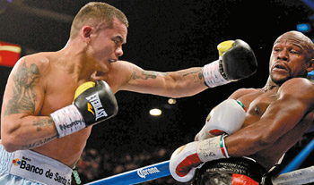 Флойд Мэйуэзер-младший уклоняется от удара Маркоса Майданы