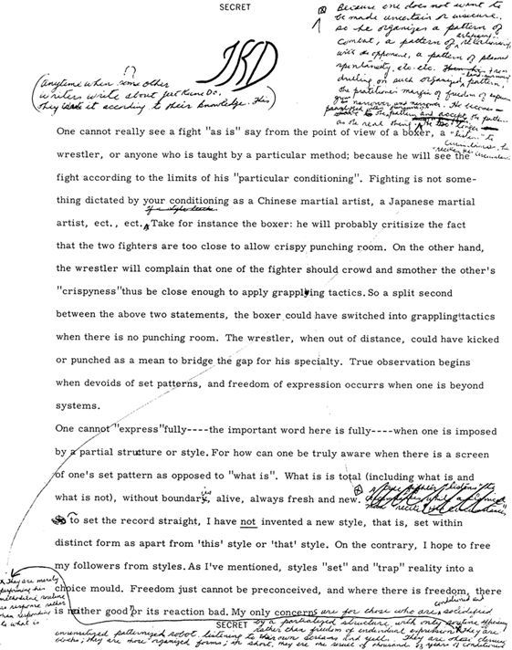 Да будет известно раз и навсегда: сочиняя, модифицируя или как-то иначе, я не изобрел новый стиль, то есть стиль, заданный в рамках определенной формы и законов, отличный от «этого» стиля или «того» метода. Напротив, я надеюсь освободить своих последователей от упорного следования стилю, шаблону или образцу. Помните, что ДКД — это просто название, зеркало, в котором мы видим себя. В названии нет ничего особенного.