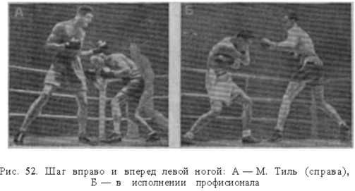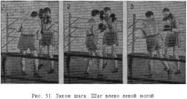 1. Шаг влево левой ногой (для боксера правши) всегда целесообразен и желателен (рис. 51). Именно этим шагом боксер раскрывает относительно закрытую позицию противника (правши).