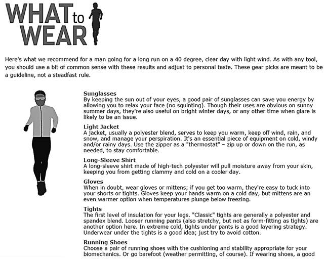 На сайте журнала Runner’s World есть любопытный сервис, который помогает проверить, верно ли вы экипированы для тренировки. Найти его можно по адресу www.Runnersworld.com/whattowear (https://goo.gl/sNxuF3).