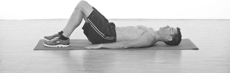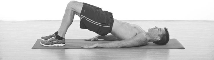 2. Вдавив пятки в пол, напрягите брюшной пресс и оторвите ягодицы от пола. Поднимите бедра так, чтобы тело образовало одну прямую линию от груди до коленей. Верхняя часть спины, затылок и стопы остаются на полу. Напрягите брюшной пресс, мышцы ягодиц и поясницы, чтобы удерживать это положение 5–30 секунд. Обратным движением медленно опустите ягодицы на пол.