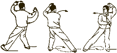 Обратить внимание: правый кулак сжат без напряжения, правое плечо следует за выносом кулака, вытягиваясь немного вперед. Плечи и локти опущены, правая рука чуть согнута. В конечном положении направление на 9 часов.