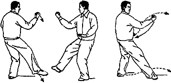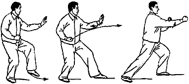 3. Перенести вес на правую ногу и выставить вперед левую для принятия позиции “лук-стрела”. Одновременно вынести левую кисть чуть вверх и вперед ладонью наклонно вниз. При этом правый кулак отводится к правому боку и внешней стороной направлен вниз. Смотреть на левую кисть (рис. 159, 160).
