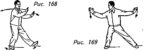 Движение 1 (продолжает рис. 167): Перенесите вес своего тела на правую ногу и поверните весь корпус вправо. Выполняя поворот тела, выверните кончики пальцев левой ноги наружу и перейдите на правый “шаг вдоль кромки радуги”. Одновременно с этим разведите руки в стороны, следя за тем, чтобы локти расслабленно опадали вниз, а ладони были направлены под углом вниз. Взгляд при этом обращен на правую руку (рис. 168, 169).