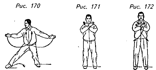 Движение 2: Медленно перенесите тяжесть своего тела на левую ногу, выворачивая носок правой ноги внутрь и отводя правую ногу назад так, чтобы расстояние между стопами было приблизительно равно ширине плеч, затем медленно выпрямляйте ноги с носками, направленными вперед. Одновременно с этим обе руки опускайте к низу живота по аркообразной траектории, потом переводите их движением внутрь и вверх до перекрещивания их перед грудью (ладони направлены к груди, правая — снаружи). Взгляд обращен прямо вперед (рис. 170, 171, 172).